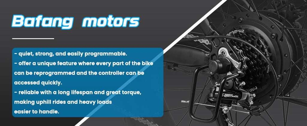 Bafang has been a global large manufacturer of e-bike components for over 10 years. Bafang motors provide riders with superior ride performance and turn your bike into a beast. They quietly deliver all the power during the ride, tackling any hill or mountain. You won't hear it when it's on. If you decide to ride without the motor, its light weight means you won't be bothered by a heavy motor. It also reduces the gyroscopic effect when steering at high speeds on city streets. An e-bike with a Bafang motor has a smooth ride and a quiet motor.